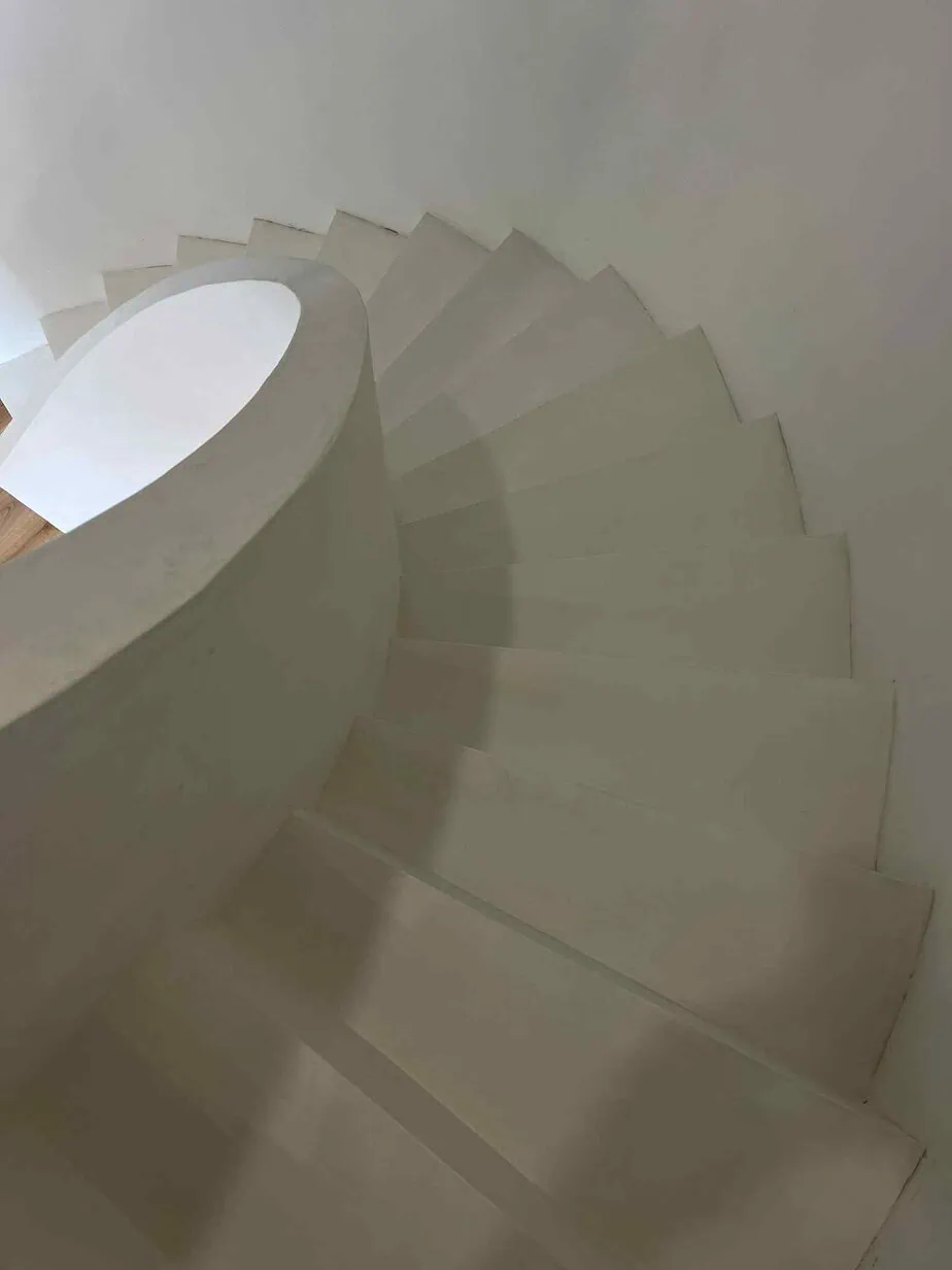 Le béton ciré a été appliqué en plusieurs couches fines sur l’ensemble des marches et sur la rampe. Le choix de la teinte crème a été fait pour apporter une touche douce et lumineuse à l’intérieur de la maison, tout en s’accordant avec le style général de la rénovation.