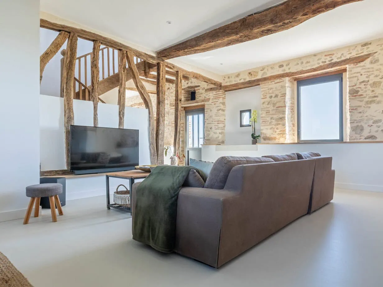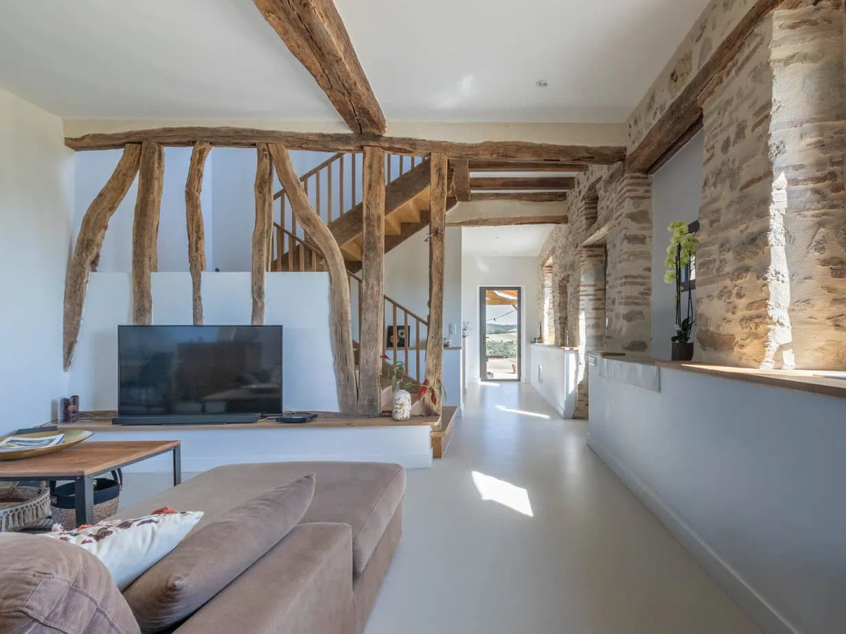 Dans ce salon à Saint‑Sulpice‑la‑Pointe, la teinte choisie a été adaptée à l’ambiance générale de la maison de famille. Le béton ciré offre une finition contemporaine, lisse et continue, sans joint apparent, ce qui donne une impression d’espace et de fluidité dans la pièce.